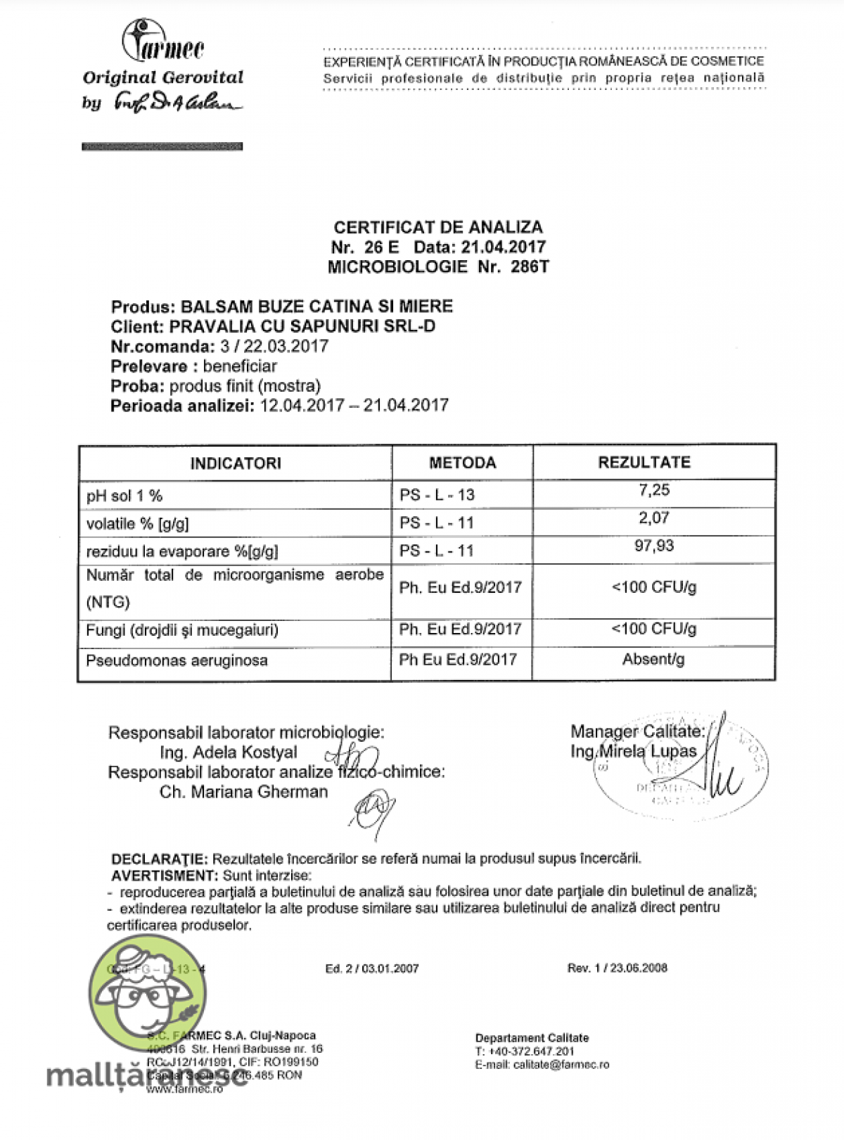 Balsam de buze cu factor de protecție solară. Conferă buzelor o îngrijire delicată și acestea se mențin perfect protejate de factorii externi și de radiațiile UV. Uleiul de cătină are proprietăți nutritive, cicatrizante, reparatoare și regenerante. Pătrunde rapid în buze, oferindu-le un luciu delicat și un parfum fin de portocală. Ingrediente (INCI): HIPPOPHAE RHAMNOIDES SEED OIL, PRUNUS AMYGDALUS DULCIS OIL, THEOBROMA CACAO SEED BUTTER, CERA ALBA, RICINUS COMMUNIS SEED OIL, TOCOPHERYL ACETATE, CITRUS AURANTIUM DULCIS OIL, HONEY, LINALOOL. Referinta CPNP:2853420. Notificat la data:29.10.2018