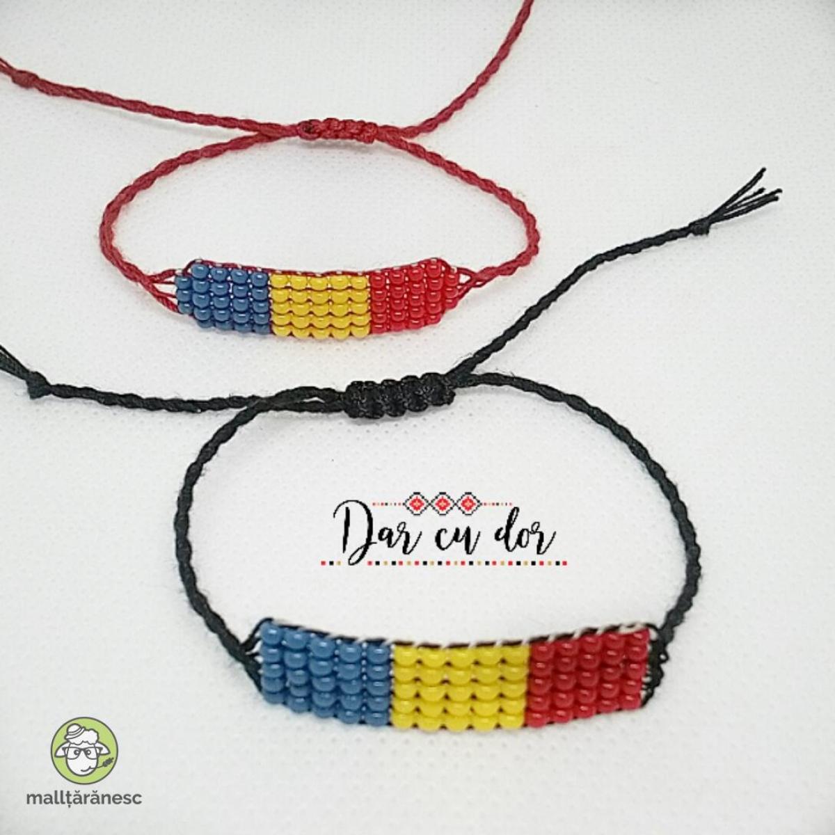 Brăţară-drapel cu şnur negru. Se poate realiza şi cu roşu la cerere. Brăţările cu motive tradiţionale "Dar cu dor" sunt lucrate exclusiv manual din mărgele mărunte şi foarte mărunte, numite şi "mărgele de nisip". Majoritatea lor au motive deosebite de ceea ce se găseşte ca tradiţional la tarabe. Nu sunt reproduceri ale bijuteriilor vechi, ci sunt compuneri noi din motive preluate de pe diverse elemente de artă populară. Câteva brăţări au motive originale. Sunt realizate cu mărgele de calitate, ceea ce se reflectă în ordonarea lor aproape perfectă, care fură privirea. Culorile mărgelelor nu se şterg în timp iar aţa folosită este deosebit de rezistentă. Brăţările cu motive tradiţionale din mărgele "Dar cu dor" sunt potrivite atât la straie de sărbătoare cât şi la ţinute moderne, fiind foarte apreciate de cei care se află peste graniţe şi chiar de către străini, care privesc cu multă admiraţie arta noastră populară. Fiecare brăţară se livrează gratuit pe cartonaş-suport. Produs realizat cu mărgelele de calitate, cu mărimea de 2mm, în culori vii şi luminoase, şi aţă rezistentă la care s-a adaugat un strop de drag şi pasiune.