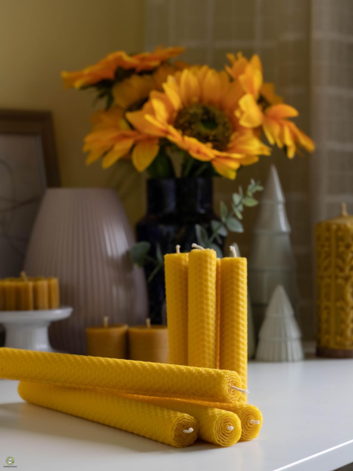 Lucrate manual din ceara de albine 100% pura si fitile din bumbac, lumanarile rulate sunt facute sa dureze. Sunt perfecte pentru evenimente de orice dimensiune si in orice anotimp, inclusiv vara (nu se vor topi). Acestea ard frumos, creand o ambianta calda si sunt perfecte chiar si pentru cei sensibili. Lumanarile din ceara de albine au o ardere curata, fara a produce fum. Timp mediu de ardere: 10-11 ore Greutate: 66-68g Inaltime: 26cm