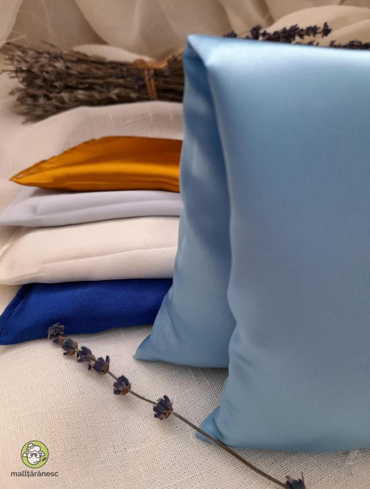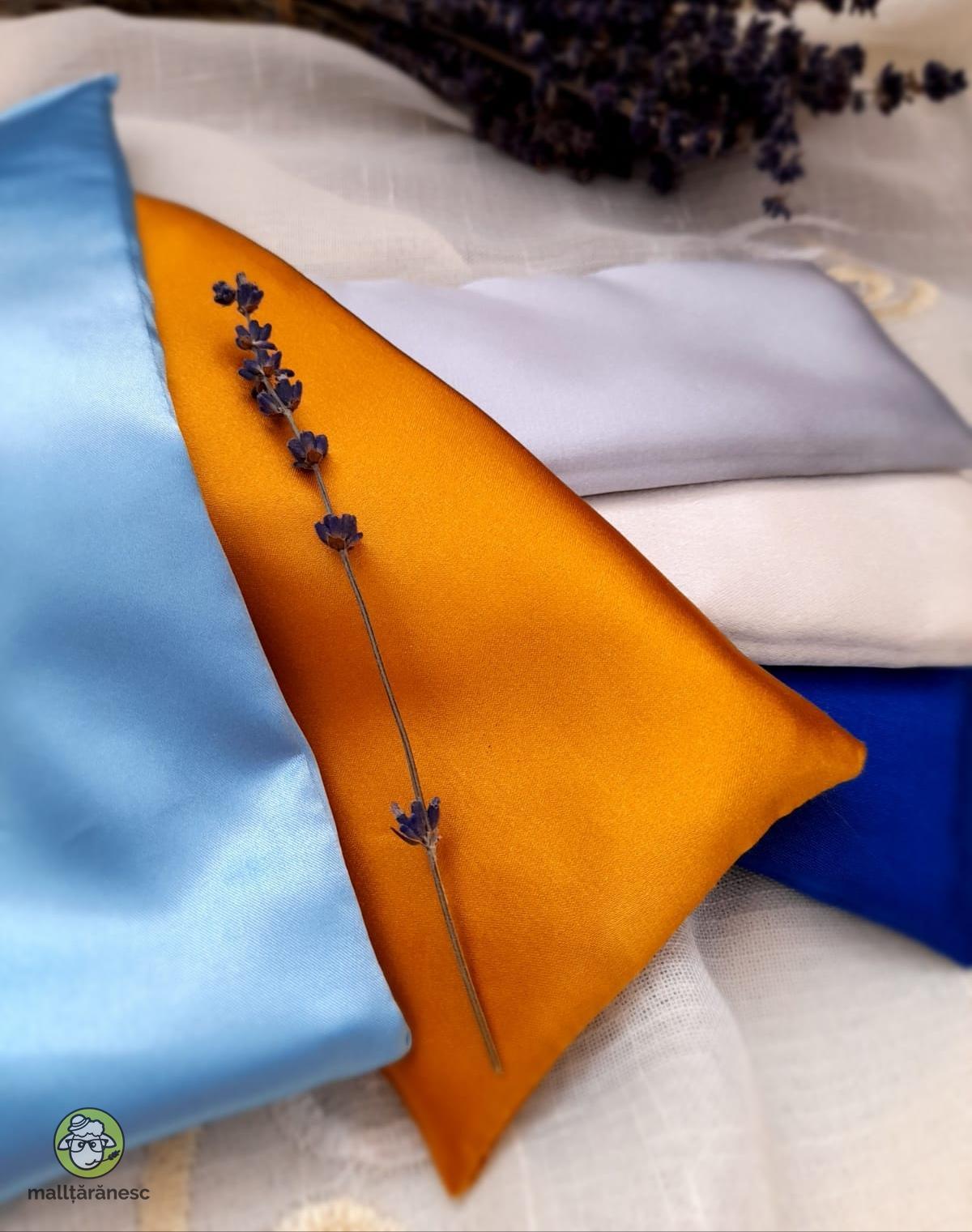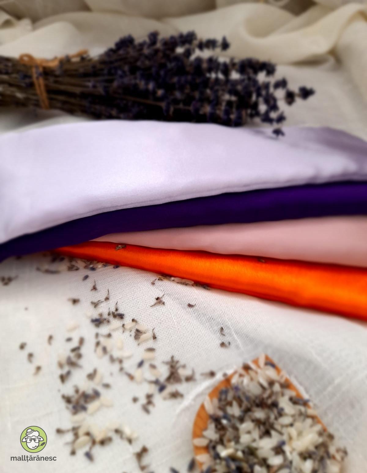 Pernițe pentru ochi sau frunte, umplute cu lavandă organică și orez, realizate din materiale moi, vesele și plăcute la atingere, cu suficientă greutate pentru a experimenta o presopunctură blândă în jurul ochilor.