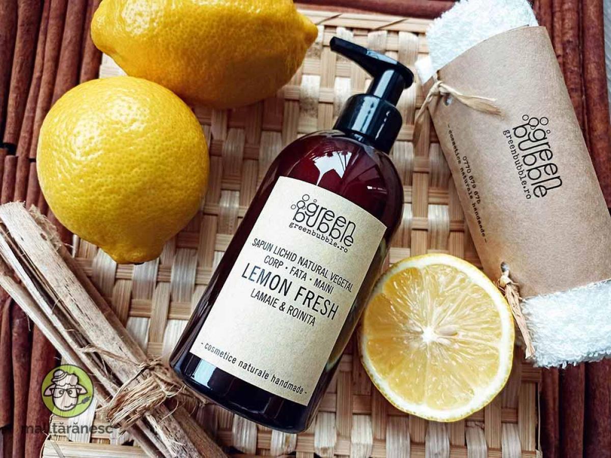 Săpun Lemon Fresh cu Lămâie și Roiniță. Un săpun lichid natural hidratant, emolient, stimulativ, cu un miros proaspăt de ulei esențial de lămâie și roiniță. Săpunul este potrivit pentru toate tipurile de piele, benefic pentru corp, față și mâini.