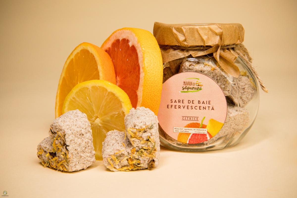Ingredientele din aceasta sare de baie efervescenta cu citrice au fost alese pentru proprietăţile lor de hidratare și catifelare. Au rol de îndepărtare a celulelor moarte, de calmare şi relaxare a pielii. Caracteristici sare de baie efervescenta cu citrice Argila gri calmează şi catifelează pielea şi este potrivită tuturor tipurilor de ten. Sarea marină este recunoscută încă din timpuri străvechi pentru proprietățile sale curative și de înfrumusețare. Aceasta este bogată în minerale de care corpul și pielea noastră au nevoie pentru a rămâne tinere și sănătoase. Uleiul de migdale dulci conţine din belşug vitaminele E şi D, minerale esenţiale (magneziu şi calciu), pentru un efect puternic emolient, ce-l recomandă în tratarea pielii uscate, crăpate, iritate sau afectate de mâncărimi. Se absoarbe foarte bine în piele. Bicarbonatul de sodiu neutralizează acizii de pe piele. Parfumul de citrice este înviorător aduce prospeţime și bună dispoziție. Este reconfortant, pozitivant și relaxant, are acțiune de calmare și echilibrare a sistemului nervos și a spiritului. Mod de utilizare: Pentru un efect imediat recomandăm a se folosi după duş! Umpleţi cada cu apă şi puneţi 2-3 inimioare efervescente pline de uleiuri aromate şi petale de flori, iar relaxarea poate începe! Ingrediente (INCI): SODIUM BICARBONATE, CITRIC ACID, SODIUM CHLORIDE, PRUNUS AMYGDALUS DULCIS OIL, TOCOPHERYL ACETATE, CALENDULA OFFICINALIS FLOWER POWDER, CITRUS LIMON LEAF/PEEL/STEM OIL, ARGILLA EXTRACT, CITRUS AURANTIUM DULCIS OIL, LIMONENE, CITRAL. Referinta CPNP: 2860568. Notificat la data: 06.11.2018